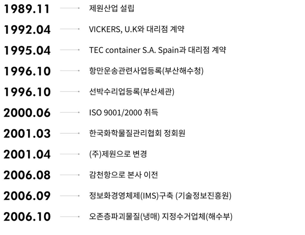 COMPANY 검증된 품질과 기술 지원으로 책임지는 선박 운항 글로벌 협력과 항만 보급 경험을 기반으로 고객의 신뢰와 선박 운항 효율을 높입니다 (주)제원 홈페이지를 방문해 주셔서 대단히 감사합니다.1989년 창사 이래, 저희 JWC는 정도(正道), 초신(草新), 인화(人和)를 경영이념으로 양질의 제품공급 및 기술의 첨단화를 통해 고객에게 보답하고자 최선을 다하고 있습니다.앞으로도 고객여려분의 선택에 저희 JWC는 최고의 품질과 서비스로 보답해 드릴 것을 약속드립니다.저희 JWC는 ‘고객은 기업의 은인이며, 미래를 가르쳐 주는 스승이다.’는 말을 마음 깊이 간직하고 고객여러분의 운항비 절감에 보탬이 되도록 최선을 다하겠습니다. HISTORY